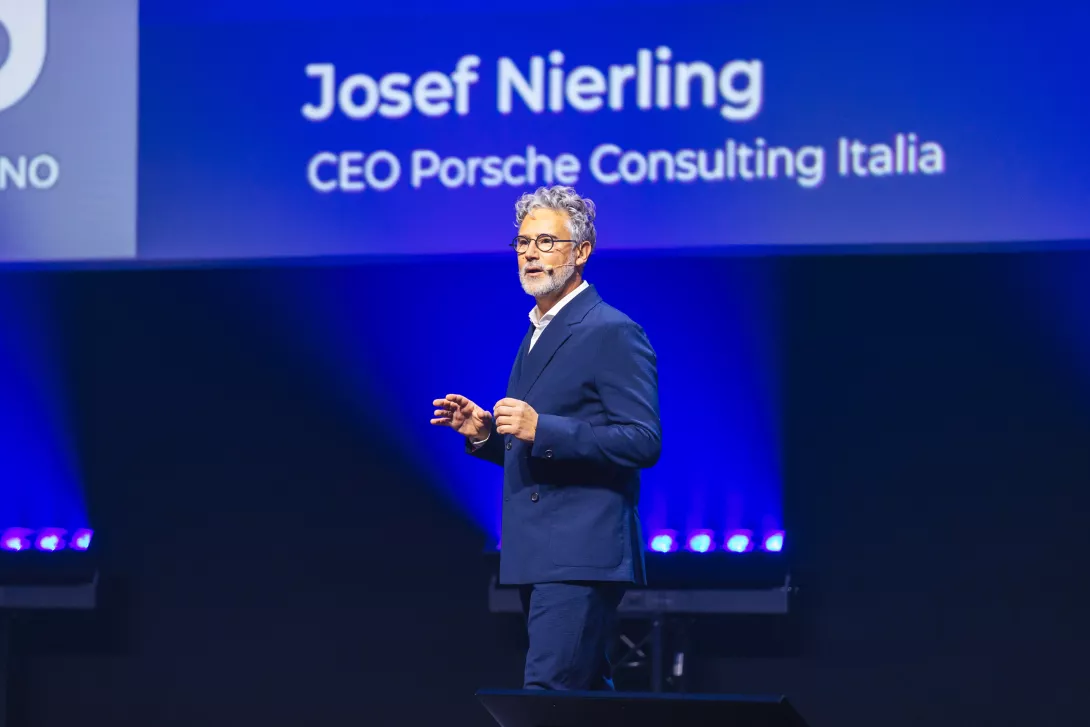 Al World Business Forum di Milano Josef Nierling, CEO di Porsche Consulting Italia, parla di un nuovo ordine tecnologico e dellimpatto della geopoltica sull competitivita globale introducendo Il noto econoomista , Nouriel Roubini